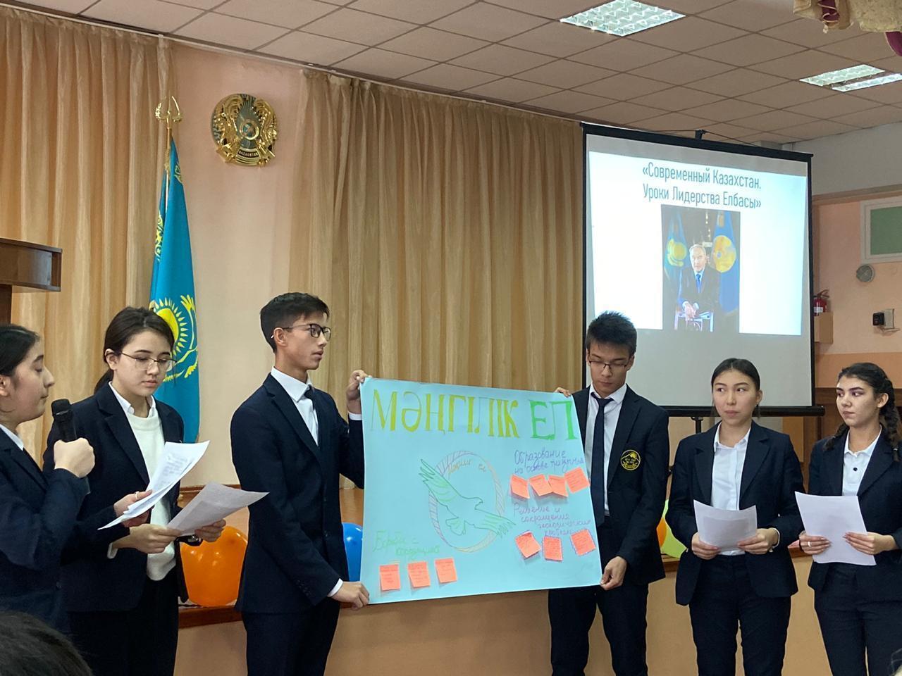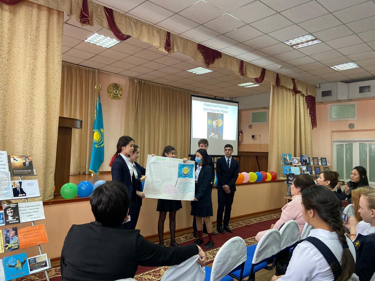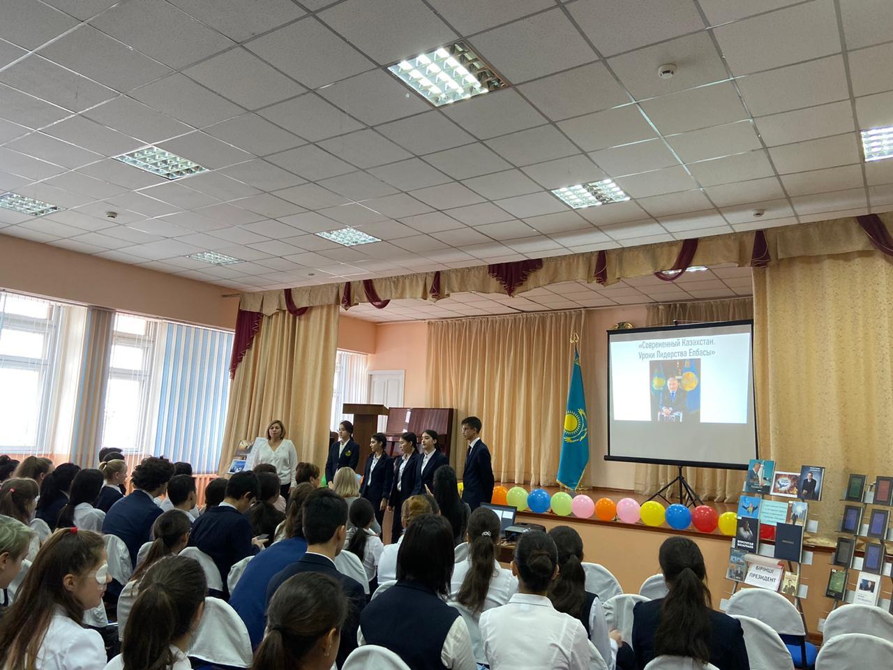 29 ноября в школе прошли классные часы и состоялись просмотры фильмов "Небо моего детства", "Так сложились звезды". Открытый урок "Современный Казахстан.Уроки Лидерства Елбасы" прошел в актовом зале школы с участием 8-11 классов.Формат урока был построен в форме игры,где представлены были 4 команды-4 политические партии "Жаркын болашак (8А),"Білімді ел"(9А),"Нур жастар"(10А) и 2Мәңгілік ел"(11А).Каждая партия представила свою политическую программу,а зрители оценивали,какая лучше,интереснее. По завершению урока каждая команда прочитала свой посыл будущим поколениям.Гостем урока была Карабалаева Тохтаркуль Ахметкалиевна,методист ГЦНТО. Она поздравила ребят с праздником и пожелала всем творческих успехов.