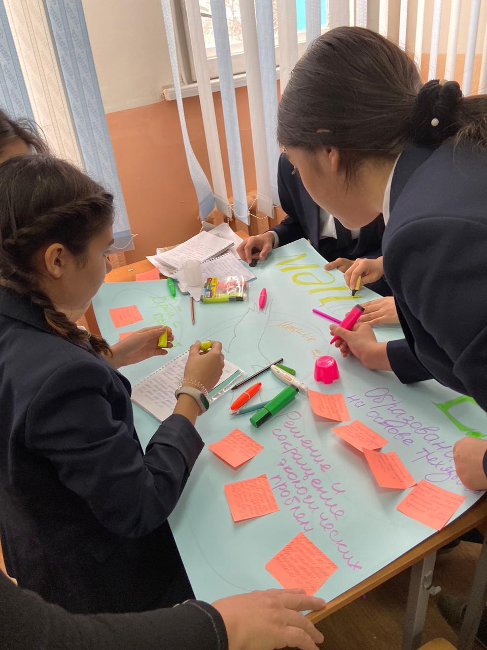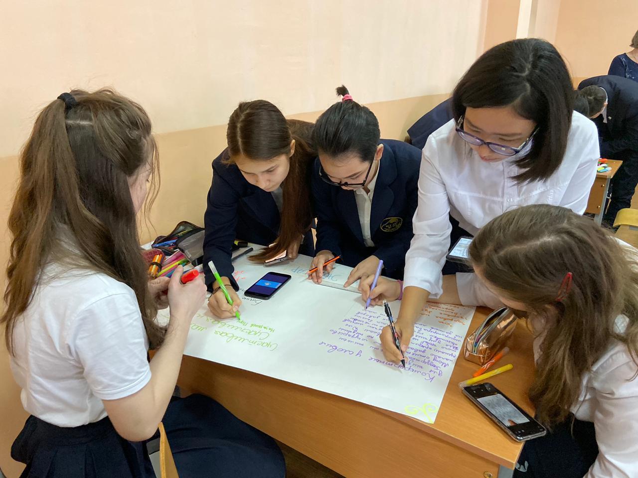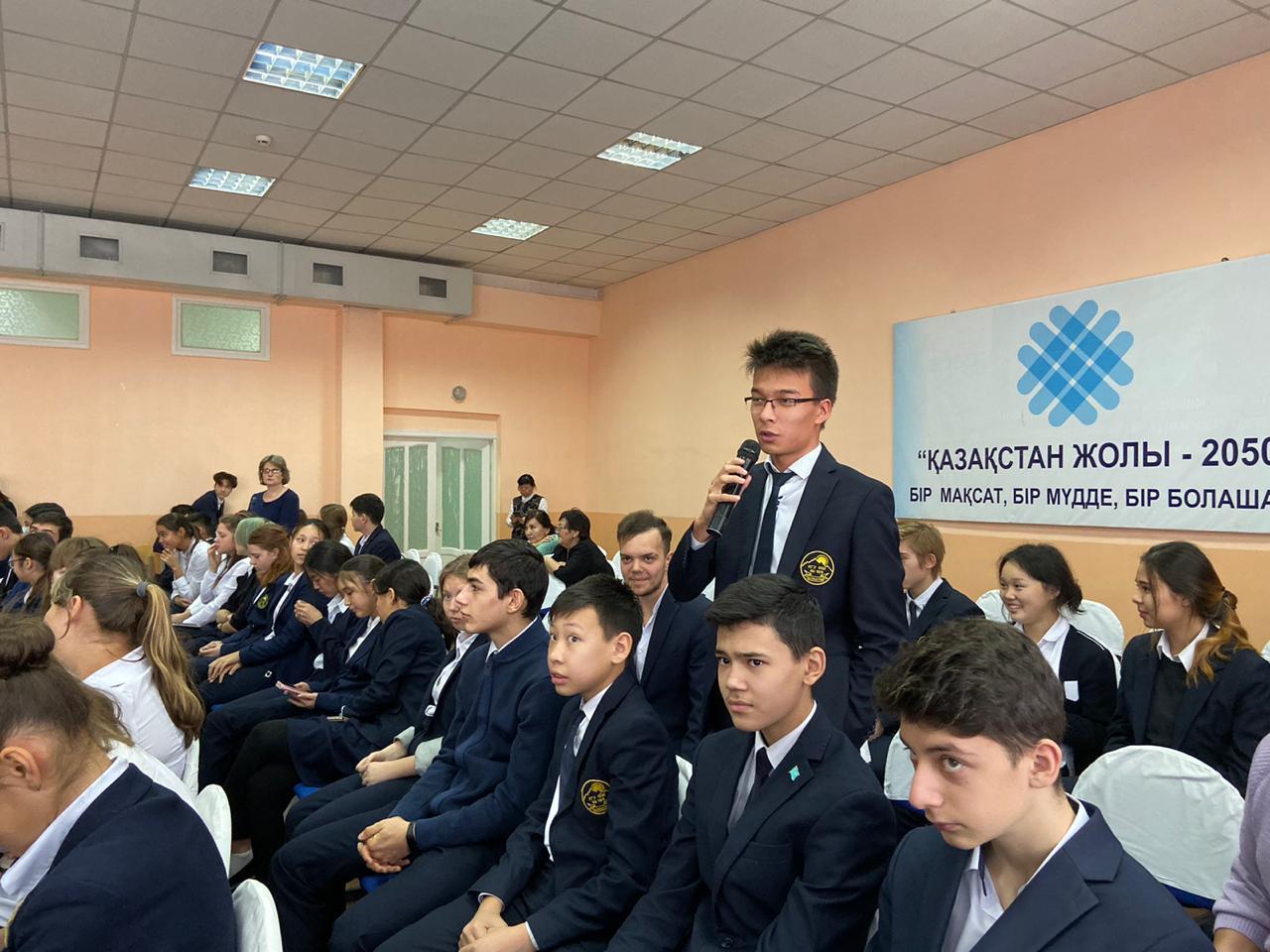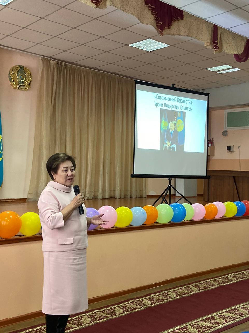 29 ноября в школе прошли классные часы и состоялись просмотры фильмов "Небо моего детства", "Так сложились звезды". Открытый урок "Современный Казахстан.Уроки Лидерства Елбасы" прошел в актовом зале школы с участием 8-11 классов.Формат урока был построен в форме игры,где представлены были 4 команды-4 политические партии "Жаркын болашак (8А),"Білімді ел"(9А),"Нур жастар"(10А) и 2Мәңгілік ел"(11А).Каждая партия представила свою политическую программу,а зрители оценивали,какая лучше,интереснее. По завершению урока каждая команда прочитала свой посыл будущим поколениям.Гостем урока была Карабалаева Тохтаркуль Ахметкалиевна,методист ГЦНТО. Она поздравила ребят с праздником и пожелала всем творческих успехов.