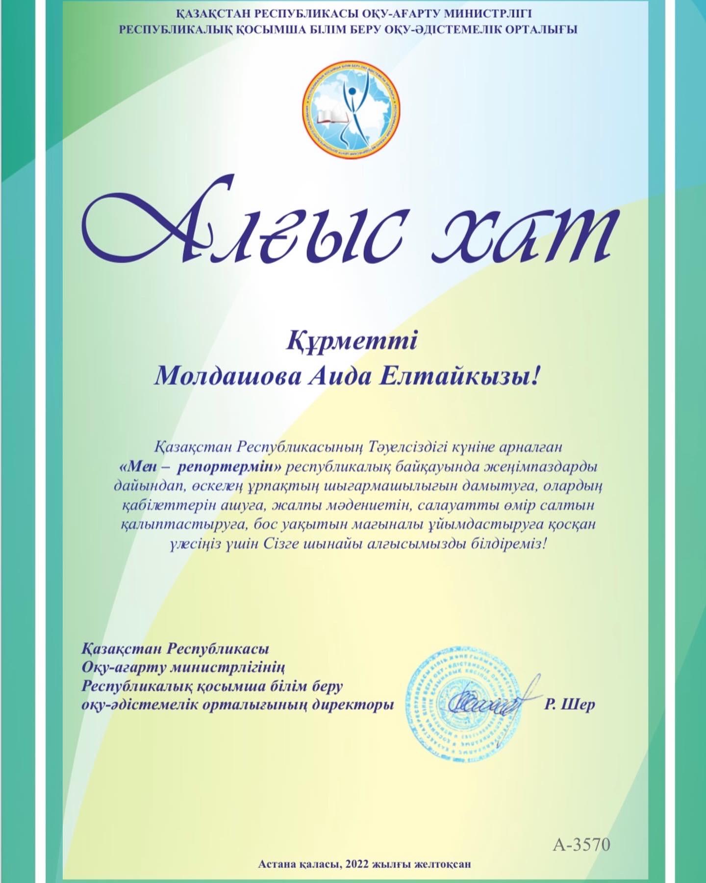 От всей души поздравляем ученицу 10А класса, министра школьного парламента Нурханову Камиллу и руководителя зам.директора по ВР Молдашову Аиду Елтаевну за занятое почетное 3️⃣-место на Республиканском конкурсе «Я-репортер»🤩😘🥉🥳💐,конкурс проводился Республиканским учебно-методическим центром дополнительного образования Министерства просвещения РК 🇰🇿♥️👍🏼.Отличное начало 2023 года!🙏🏼😍✨